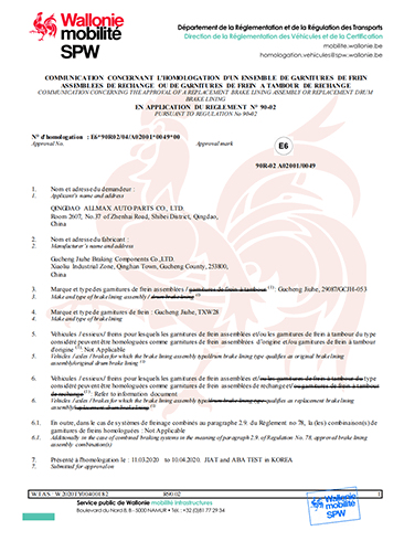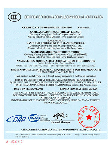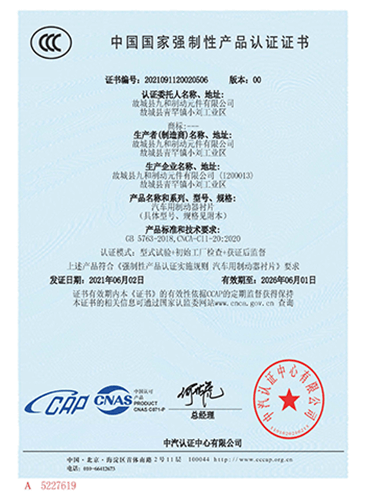 故城縣九和制動元件有限公司主導產品為:汽車剎車片、裝載機剎車片。剎車片采用高溫高壓的熱壓工藝、設備、生產線、能保證質量穩(wěn)定,有為主機廠配套生產的經驗和能力。劉如根商標是公司主要商標,公司還有飛人標牌、蛟龍牌、橫空出世等品牌!公司有多個剎車片檢驗設備,剎車片摩擦性能定速摩擦試驗機與國家非金屬礦制品檢驗中心試驗機是同公司生產的同型號試驗機。拖曳試驗機2020年通過中國建材檢驗集團咸陽有限公司檢驗合格,剪切試驗機;布氏和洛氏試驗機。2021年公司通過國家強制性CCC認證、通過過19001-2000idt ISO 9001:2015質量體系認證,IATF16949認證,歐盟Emark認證。剎車片執(zhí)行GB/T11834-2011、GB 5763-2018標準。公司產品先后曾給山東臨工、徐工、卡特彼勒(山工)、徐州美馳車橋公司、肥城金城橋公司,山東路通橋箱科技公司,山東博士樂公司,郯城郯液公司,日照金···